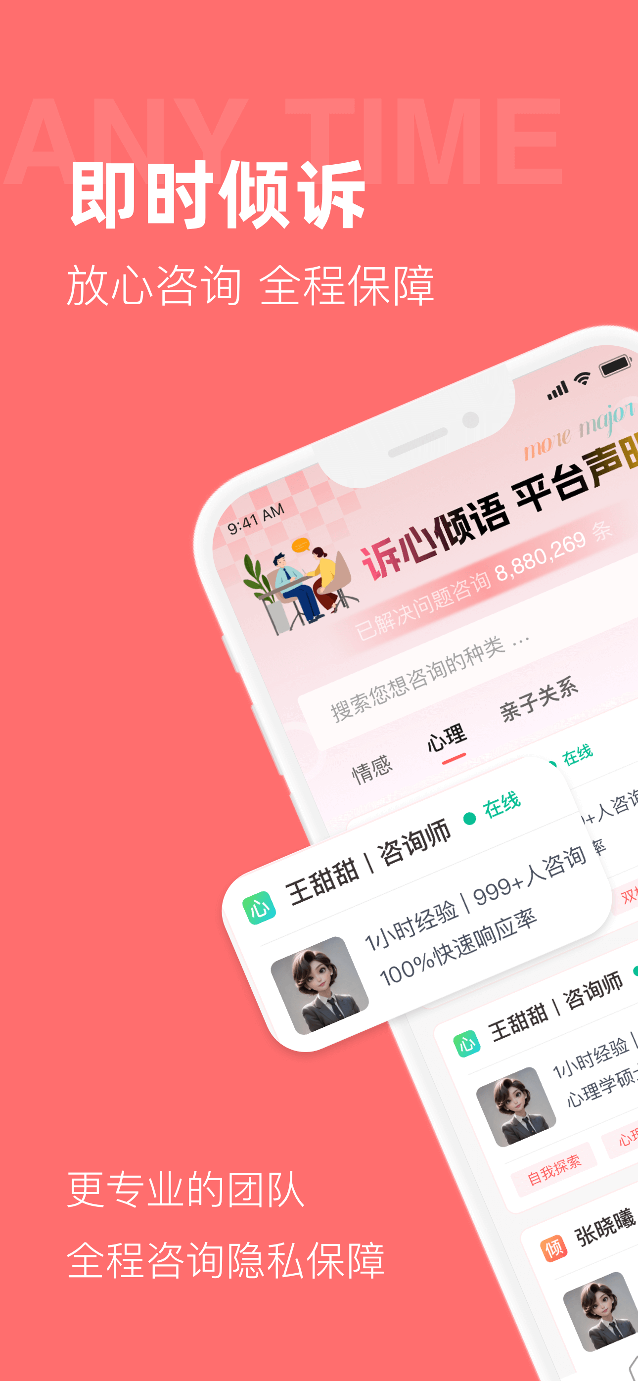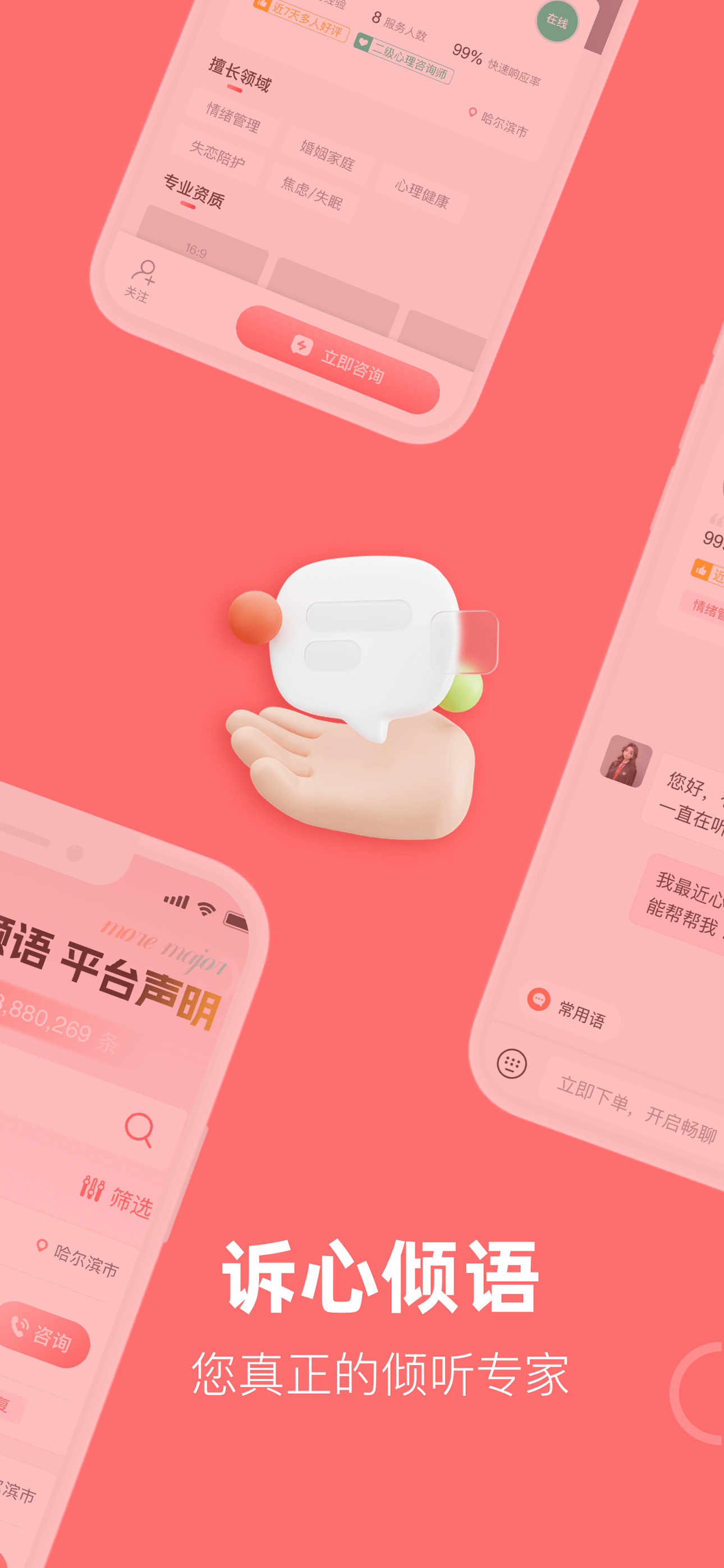 诉心倾语是一款集情感倾诉与心理咨询等多方面1对1私密咨询服务平台。